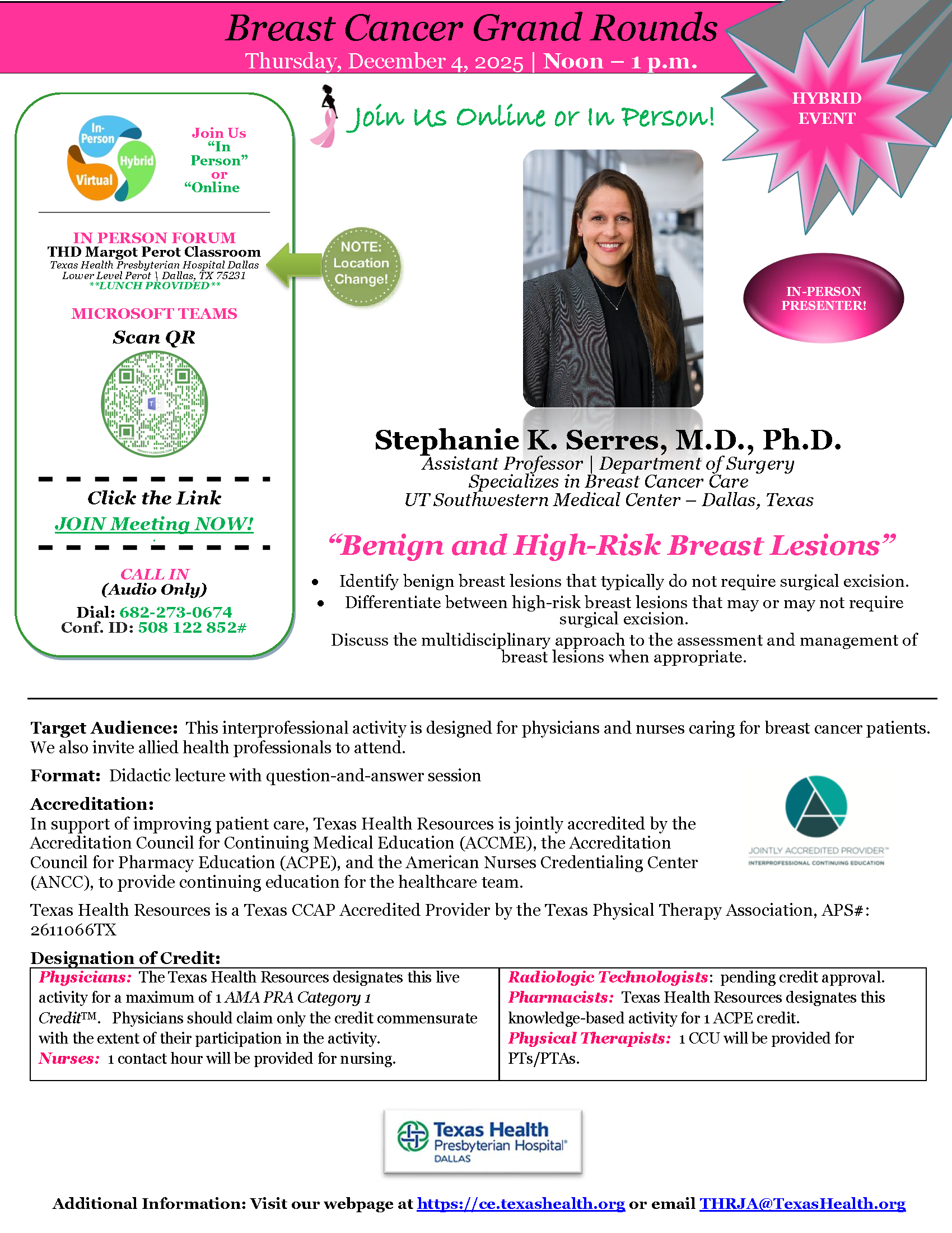 In support of improving patient care, Texas Health Resources is jointly accredited by the Accreditation Council for Continuing Medical Education (ACCME), the Accreditation Council for Pharmacy Education (ACPE), and the American Nurses Credentialing Center (ANCC) to provide continuing education for the healthcare team.