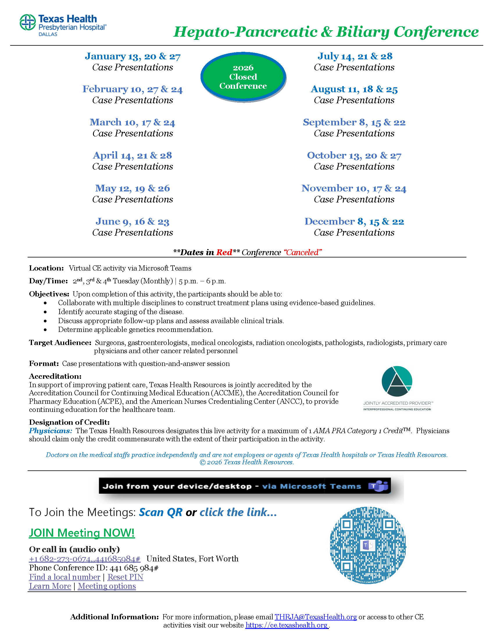 | THD Hepato-Pancreatic & Biliary Conference - Case Presentations | 01/20/2026 - 5:00pm to 6:00pm CST |