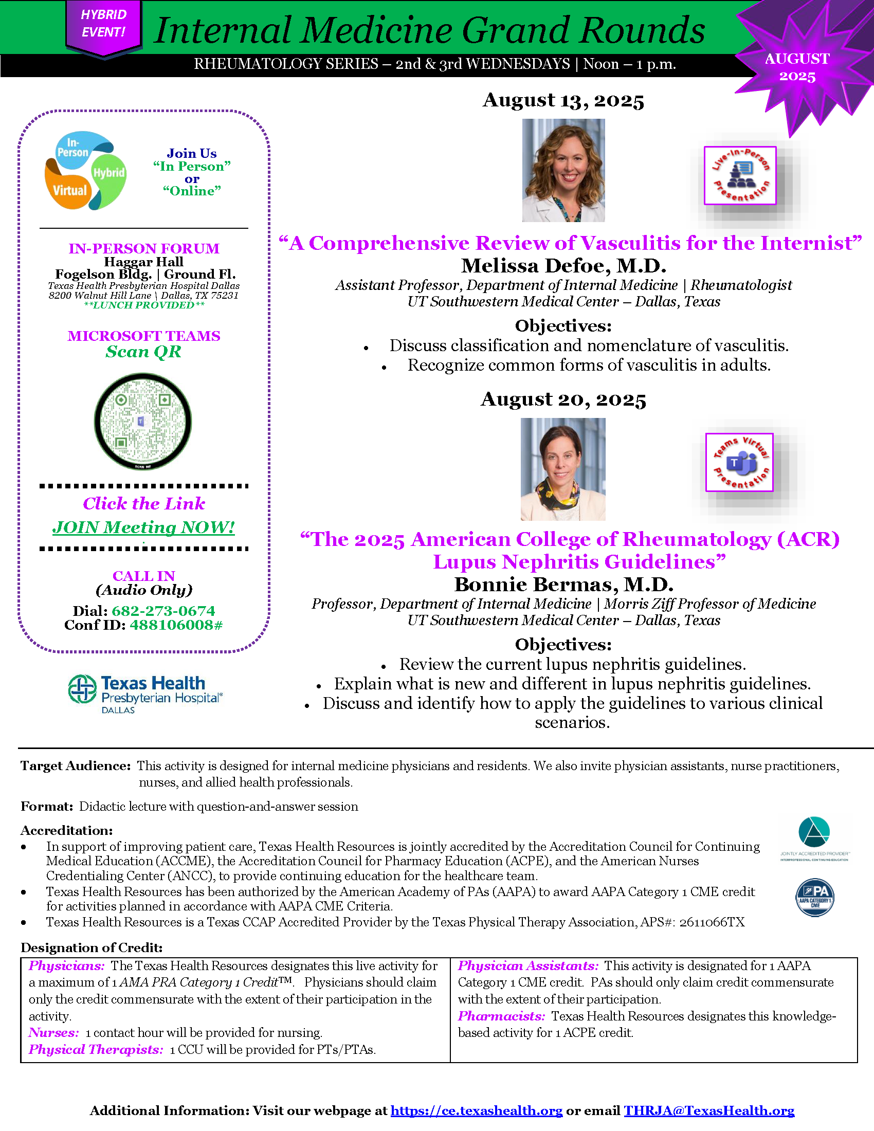 In support of improving patient care, Texas Health Resources is jointly accredited by the Accreditation Council for Continuing Medical Education (ACCME), the Accreditation Council for Pharmacy Education (ACPE), and the American Nurses Credentialing Center (ANCC) to provide continuing education for the healthcare team.