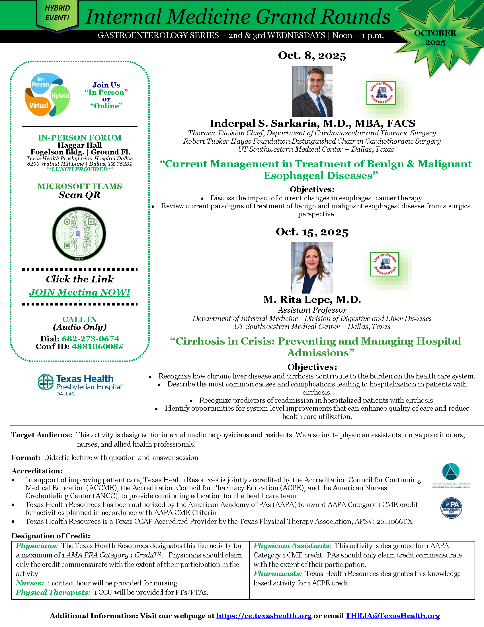 In support of improving patient care, Texas Health Resources is jointly accredited by the Accreditation Council for Continuing Medical Education (ACCME), the Accreditation Council for Pharmacy Education (ACPE), and the American Nurses Credentialing Center (ANCC) to provide continuing education for the healthcare team.