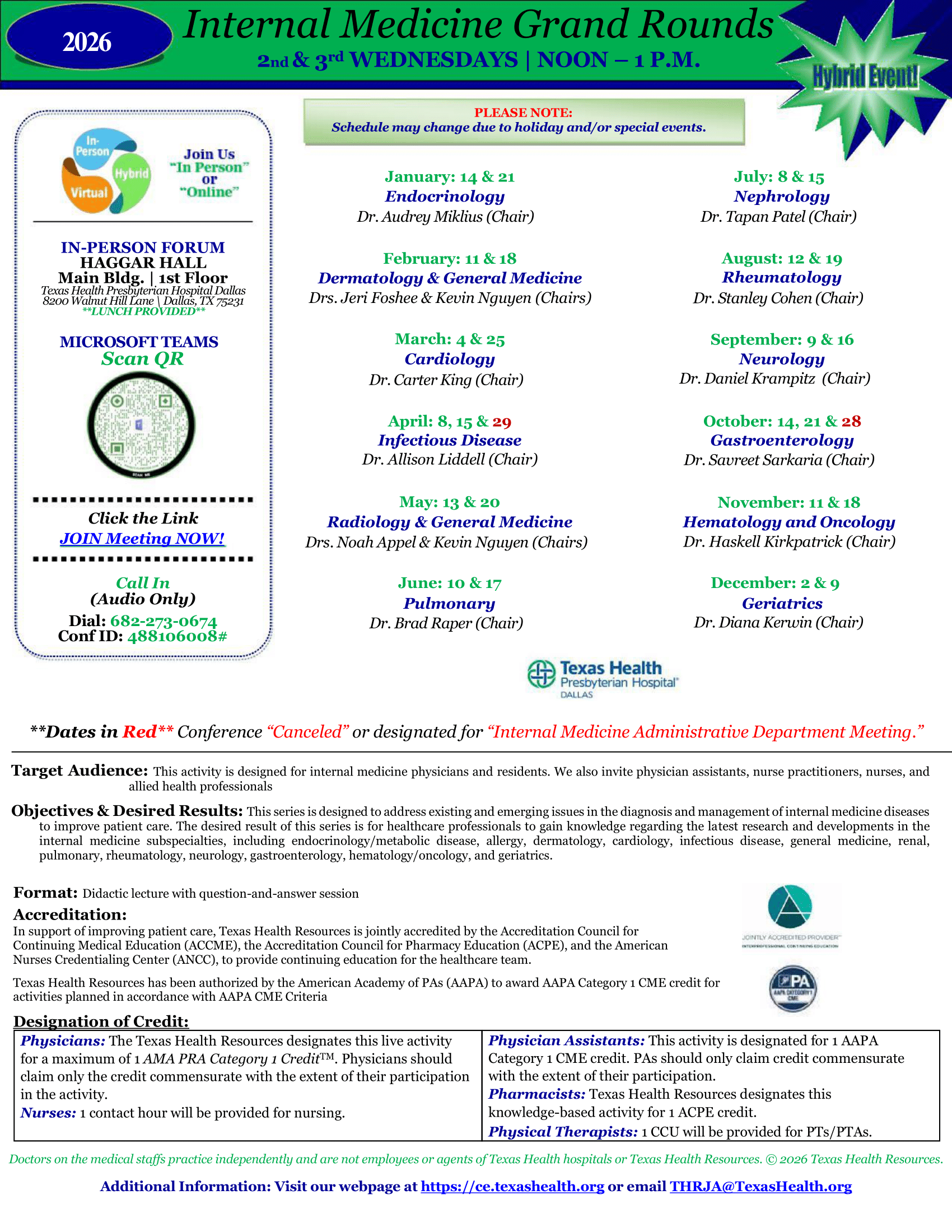 | THD Internal Medicine Grand Rounds - Drug Reaction with Eosinophilia and Systemic Symptoms (DRESS): An Update | 02/11/2026 - 12:00pm to 1:00pm CST |