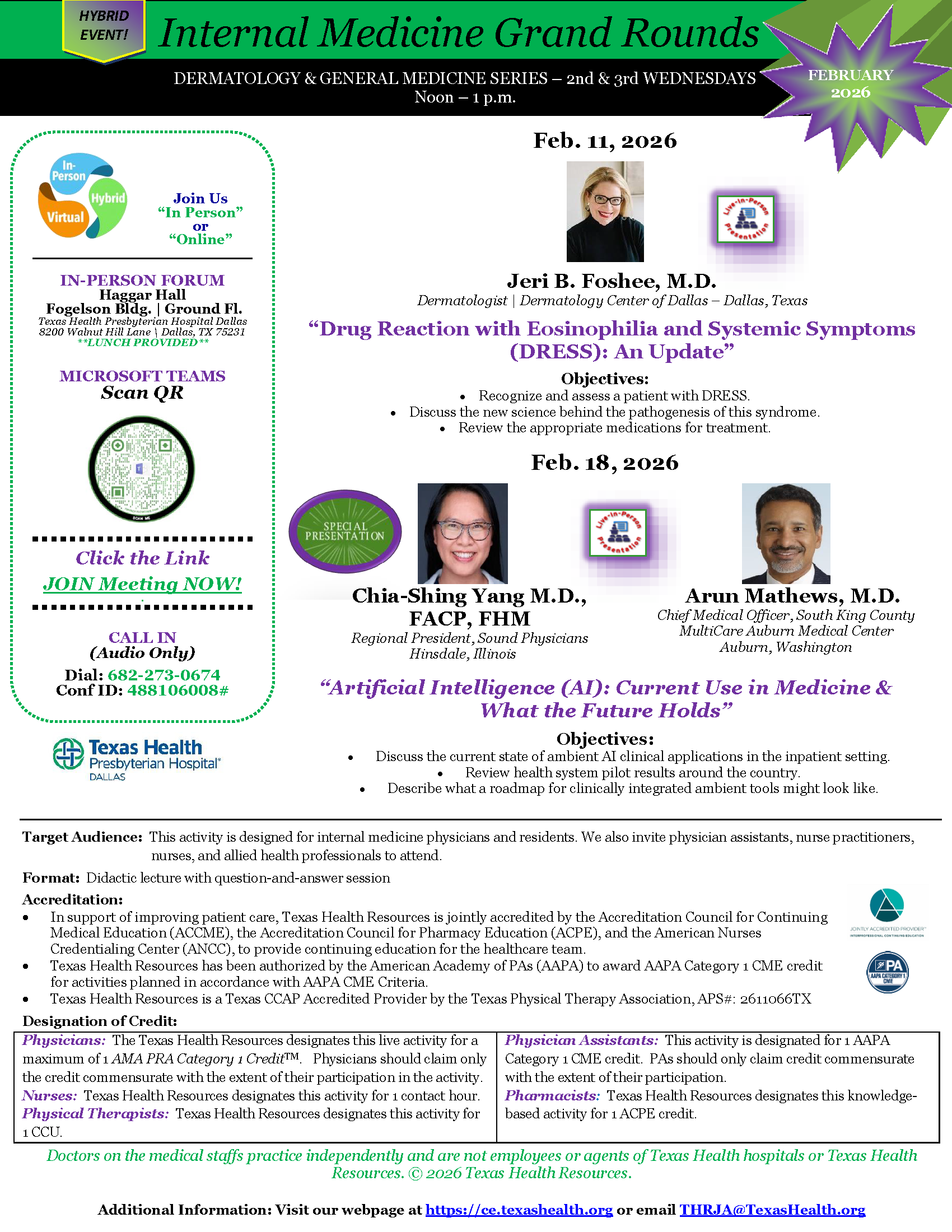 In support of improving patient care, Texas Health Resources is jointly accredited by the Accreditation Council for Continuing Medical Education (ACCME), the Accreditation Council for Pharmacy Education (ACPE), and the American Nurses Credentialing Center (ANCC) to provide continuing education for the healthcare team.