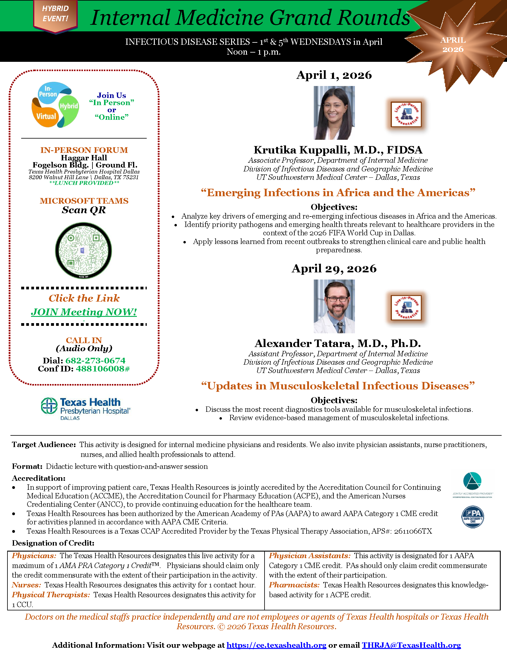 In support of improving patient care, Texas Health Resources is jointly accredited by the Accreditation Council for Continuing Medical Education (ACCME), the Accreditation Council for Pharmacy Education (ACPE), and the American Nurses Credentialing Center (ANCC) to provide continuing education for the healthcare team.