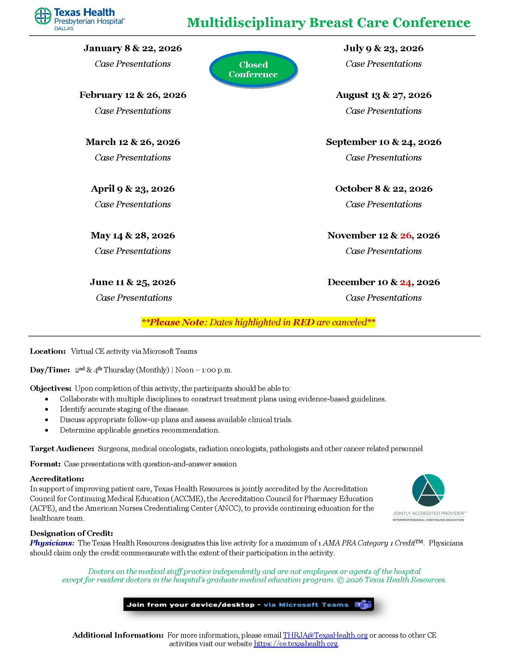 | THD Multidisciplinary Breast Care Conference - Case Presentations | 01/22/2026 - 12:00pm to 1:00pm CST |