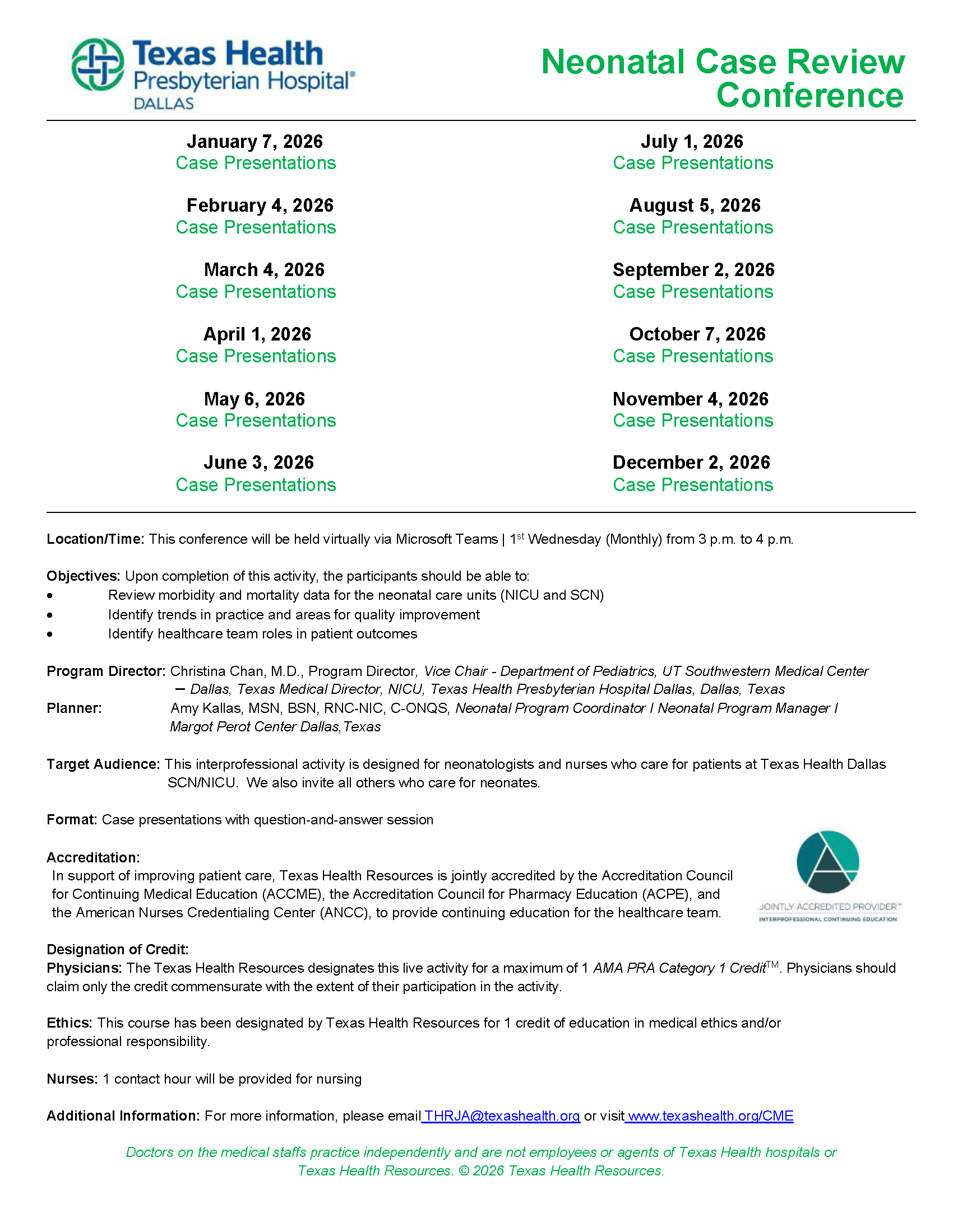 Series date: 01/01/2026 - 12:00am CST to 12/31/2026 - 11:59pm CST Annual 2026 Flier - THD Neonatal Case Review Conference (Revised 12.12.25).pdf