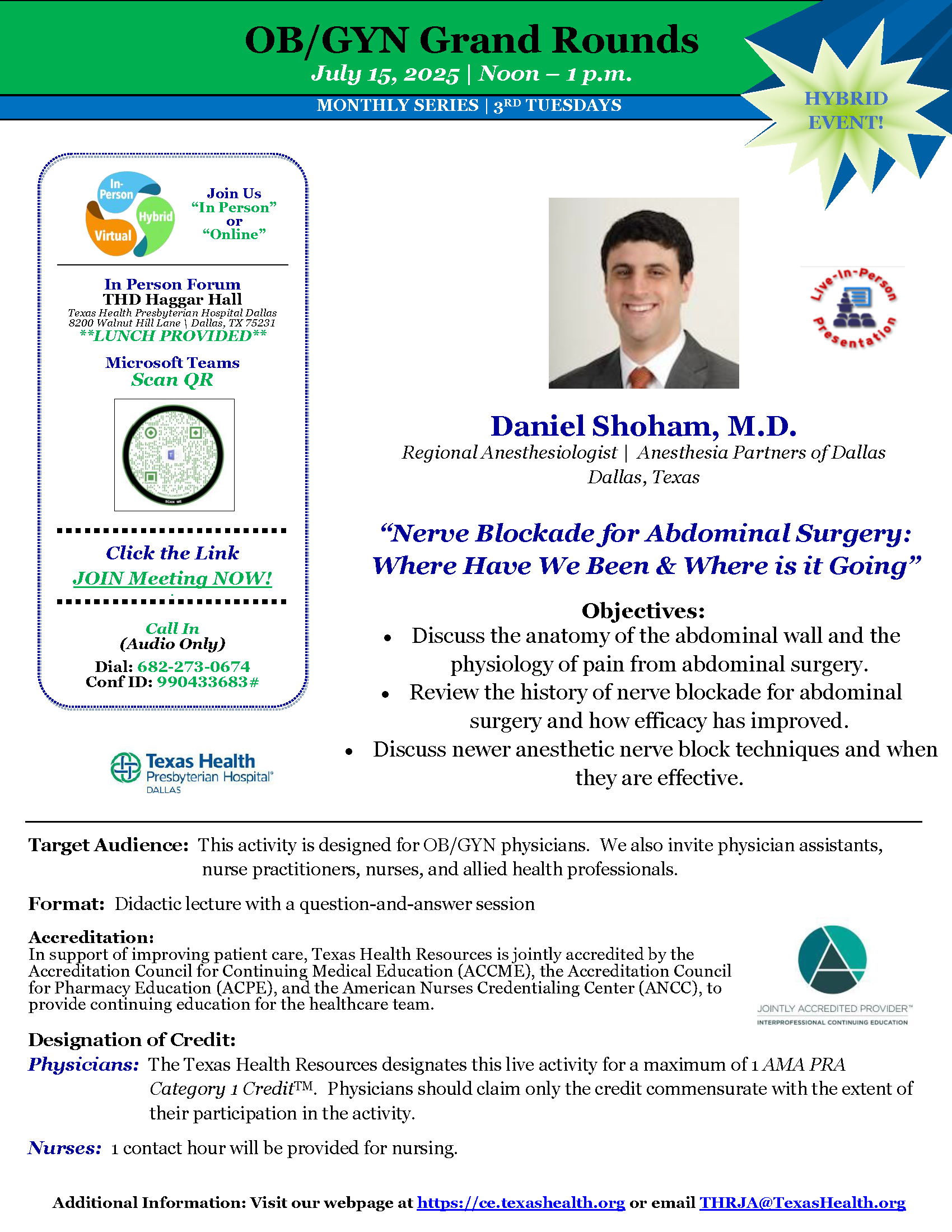 In support of improving patient care, Texas Health Resources is jointly accredited by the Accreditation Council for Continuing Medical Education (ACCME), the Accreditation Council for Pharmacy Education (ACPE), and the American Nurses Credentialing Center (ANCC) to provide continuing education for the healthcare team.