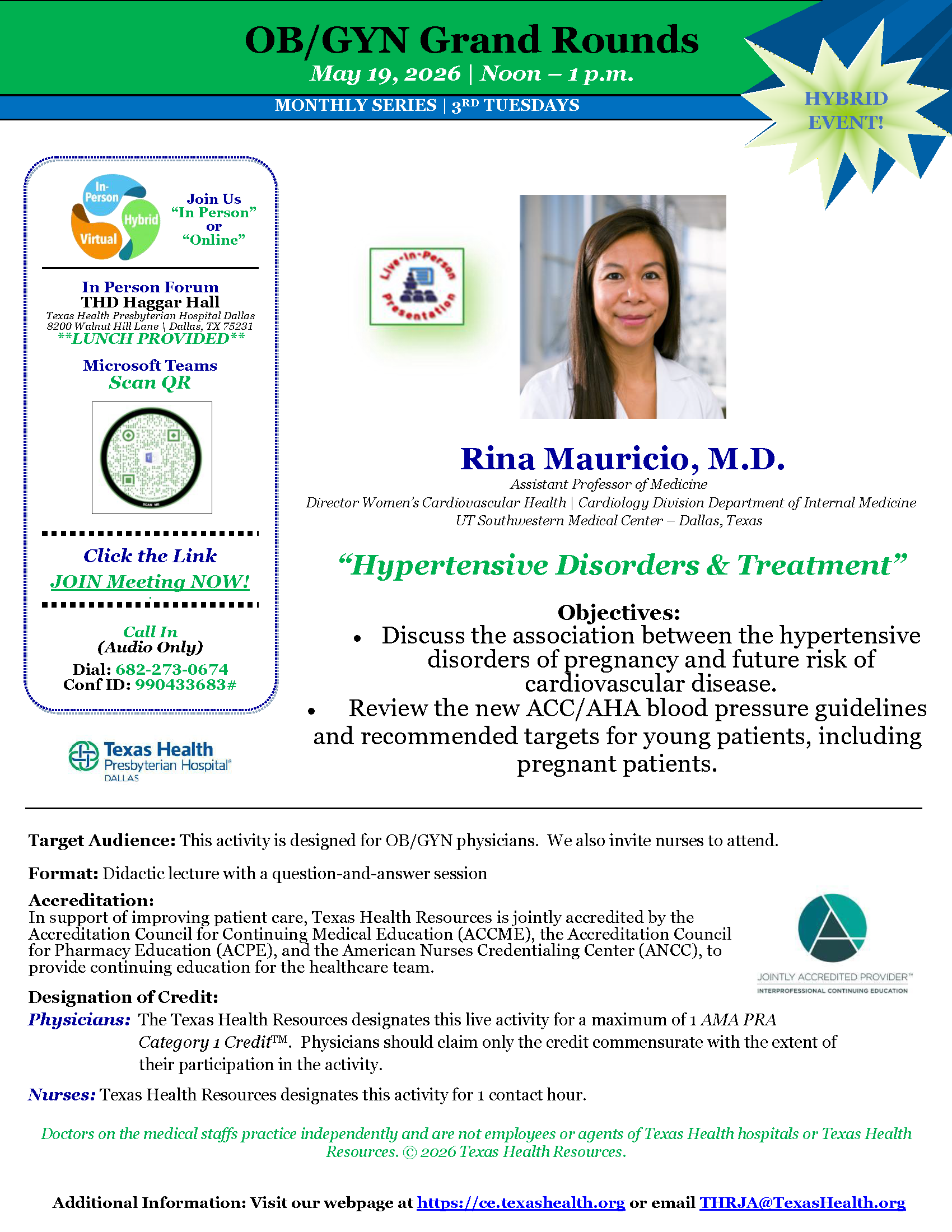 In support of improving patient care, Texas Health Resources is jointly accredited by the Accreditation Council for Continuing Medical Education (ACCME), the Accreditation Council for Pharmacy Education (ACPE), and the American Nurses Credentialing Center (ANCC) to provide continuing education for the healthcare team.
