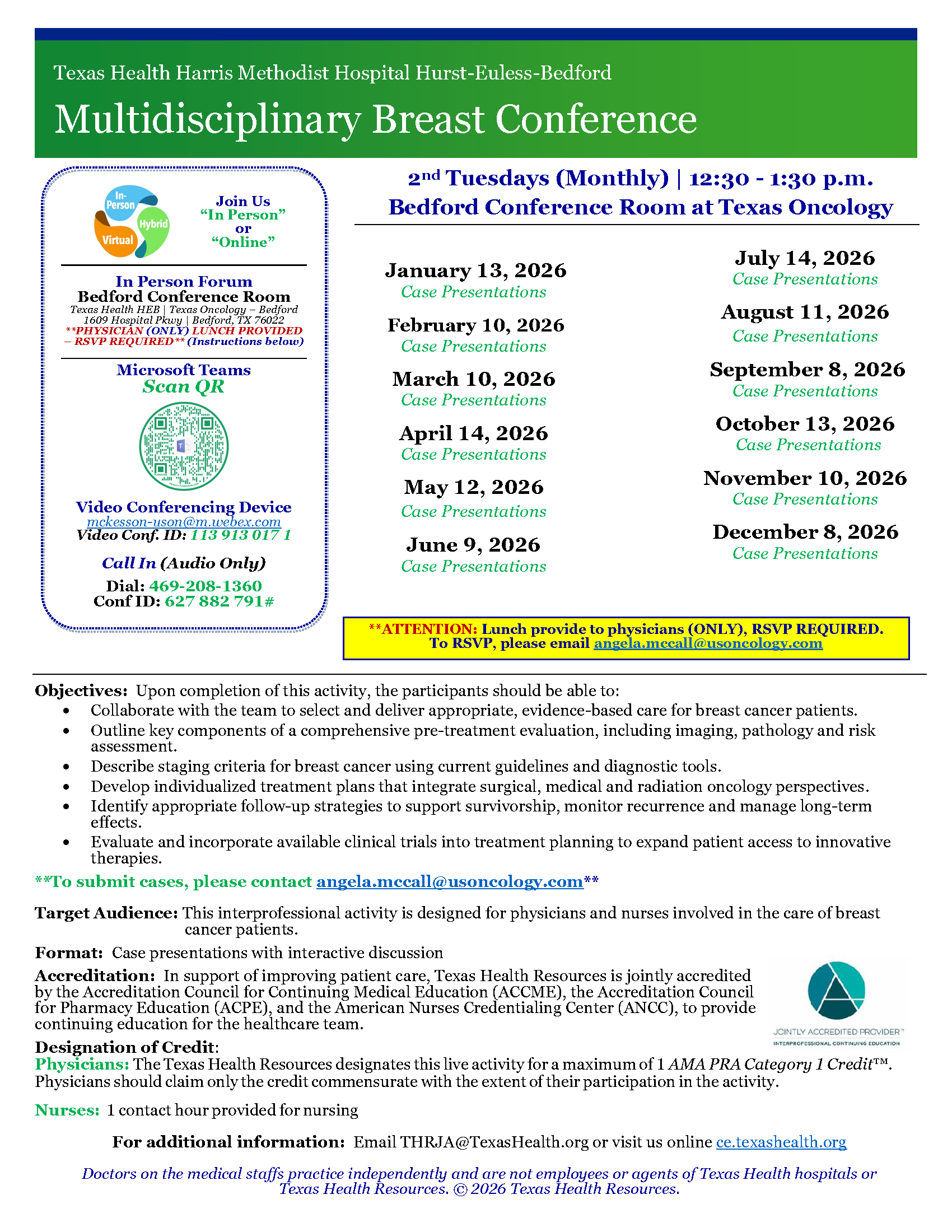 | THHEB Multidisciplinary Breast Conference - Case Presentations | 09/08/2026 - 12:30pm to 1:30pm CDT |